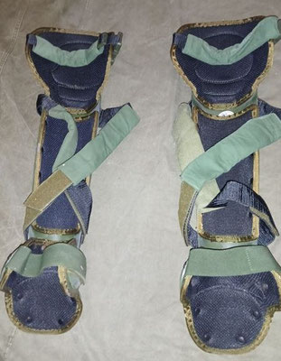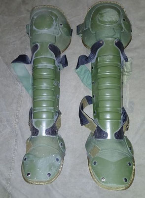Die Schlgschutzauststtung leicht besteht aus schwarzem Kunststoff welcher innen gepolstert ist und dient dazu den Träger vor Schlägen und z.B. Steinen zu schützen. Der sogenannte "Turtle" entspricht im wesentlichen den beim Motocross verwendeten Brustpanzern. Die Schienbeinschützer bestehen aus schlagfestem Kunststoff, Kunstleder und eingearbeiten Polstern. Die Schienbeinschützer können mittels zweier Riemen am Stiefel und mittels zweier elastischer gepolsterter Riemen mit Klett am Unterschenkel befestigt werden. Am Knie wird der Schienbeinschützer mit einem Gummiband und einer Öse befestigt.