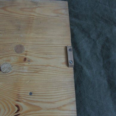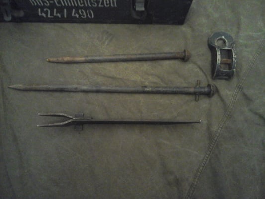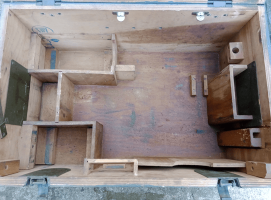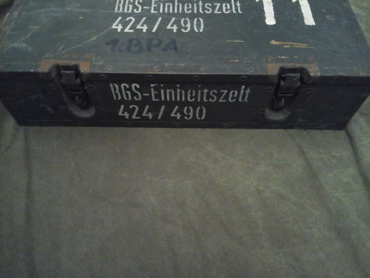 Hier zu sehen ist zwei Varianten der sehr robust und aufwendig verarbeiteten Holztransportkisten für das Zubehör des Einheitszelts. Die Kiste ist innen mit einem Inhaltsverzeichnis versehen, hat draußen eine Inhaltsbeschriftung und eine Eigentumsmarkierung der Einheit. Die Holzkiste verfügt über aufgeschraubte Metallkanten, Metallgriffe, Metallverschlüsse und Scharniere. Auf den unteren Bildern sind Teile des ursprünglichen Inhalts zu sehen. Zeltnagel 400mm, Zeltnagel 600mm Nagelheber und die Verankerungsplatten