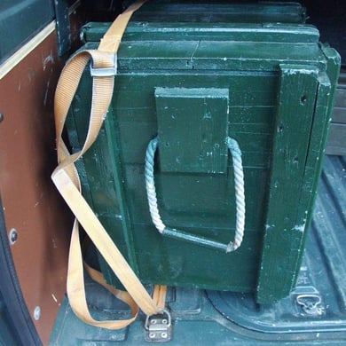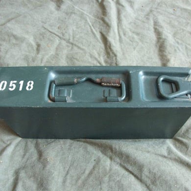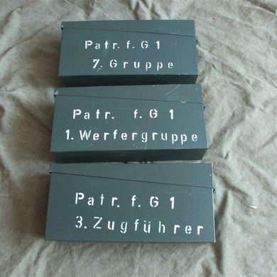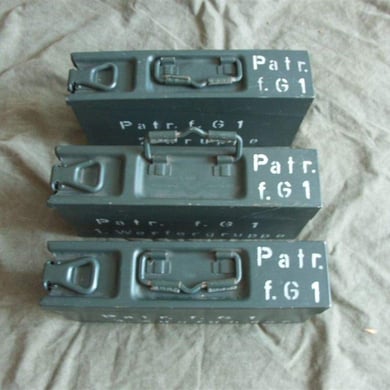 Die hier zu sehenden Gurtkästen sind baugleich mit den bei der Deutschen Wehrmacht verwendeten Gurtkästen für die MG Gurte. Die Gurtkästen haben die Abmessungen um MG Gurte mit Patronen im Kaliber 8x57 IS für das MG 42 aufzunehmen. Nachdem man später die vorhandenen MG 42 auf das Kaliber 7,62x51 umgerüstet hat wurden die gleichen Gurtkästen jedoch mit einer Einlage verwendet um einen Zwischenraum von Patrone und Gurtkastenwand zu vermeiden. Die oben zu sehenden beschrifteten Gurtkästen wurden zur Aufbewahrung der Einsatzmunition bzw Magazine der betreffenden Gruppe für deren G 1 verwendet.