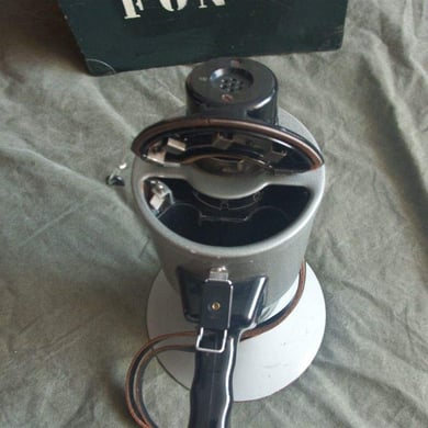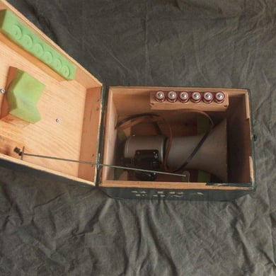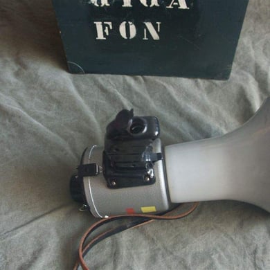 Das hier abgebildete GIGAFON ist eines älterer Bauart wird mit 6 C Zellen betrieben und es besteht die Möglichkeit ein Tonbandgerät anzuschließen. Die Lautstärke ist regelbar und es hat einen Lederriemen um es über der Schulter zu tragen. Bei Nichtbenutzung wurde das GIGAFON in dem zu sehenden Holzkoffer aufbewahrt.