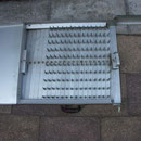 Das Sperrgerät 1 besteht aus Aluminium Blechen welche wie eine Art Zieharmonika auseinander gezogen werden können und im zusammengeschobenen Zustand in dem am hinteren Ende befestigten Koffer zum Transport verstaut werden kann. Die auf den Blechen befindlichen Nägel sind hohl und verfügen über mehrere Schlitze um den Luftaustritt des Reifens, welcher über den Nagelgurt gerollt ist, zu vereinfach und zu beschleunigen. Die Nägel sind mit einem Kuststoffuß versehen und können so nach Gebrauch leicht mit Nägeln aus dem Zubehör- bzw. Reparatursatz ersetzt werden. Mit dem Sperrgerät 1 kann sehr schnell und einfach eine Straße gesperrt werden, so wird bei Bedarf einfach der Koffer am Straßenrand abgelegt, eine Schnur bzw. ein Seil über die Straße gelegt und dann z.B. bei Durchbruch einer Kontrollstelle einfach der Gurt mittels des Seils über die Straße gezogen. Durch die schrägen Nagelreihen werden sich beim Überfahren des Nagelgurtes gleich mehrere Nägel in die Reifen des Fahrzeuges bohren um so die Reifenluft abzulassen.