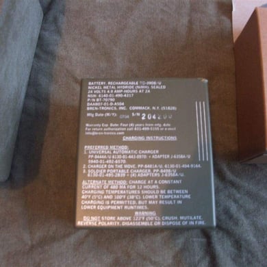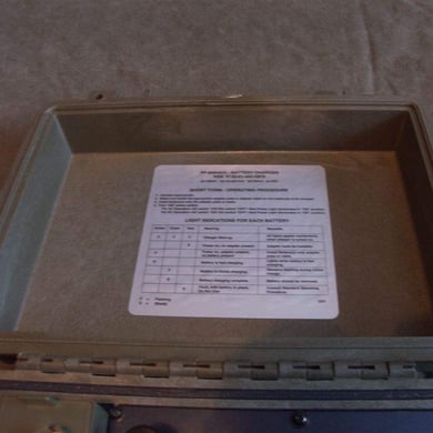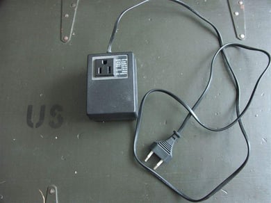 Das Keyloader Ladegerät dient zum Laden der Keyloader Akkus und zeigt das Laden mit einer roten LED  und den fertig geladenen Akku mit einer grünen LED an. Hier ist noch der Trafo zum Umwandeln der in Deutschland verwendeten 220 Volt in die vom Gerät verwendeten  110 Volt zu sehen.