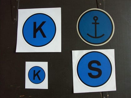 Hier zu sehen ein taktisches Zeichen (groß) der Küsteneinsatzhundertschaft (K), ein taktisches Zeichen (klein) der Küsteneinsatzhunderschaft für Krafträder. Rechts die erste Ausführung des BGS See Neustadt mit Anker darunter die zweite Ausführung (S) beide für Kfz. 7./ GSG 7 Ausführung für Kfz