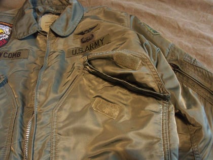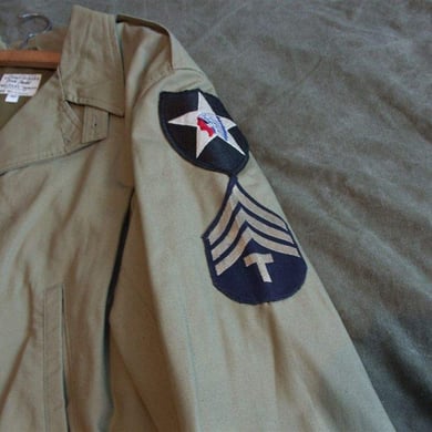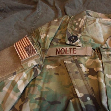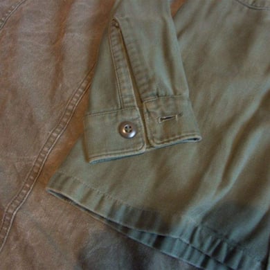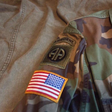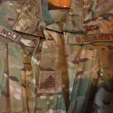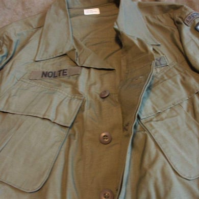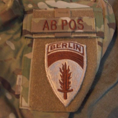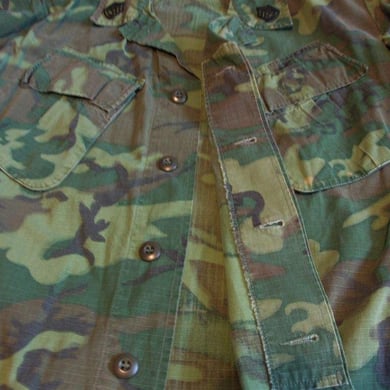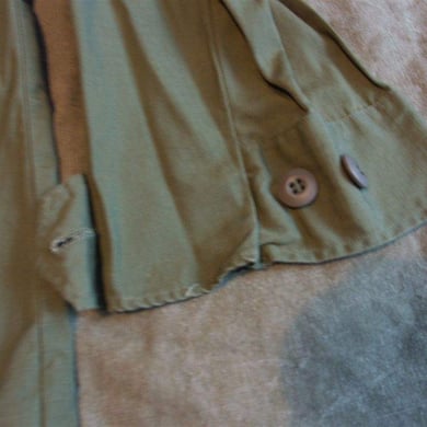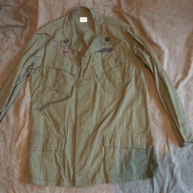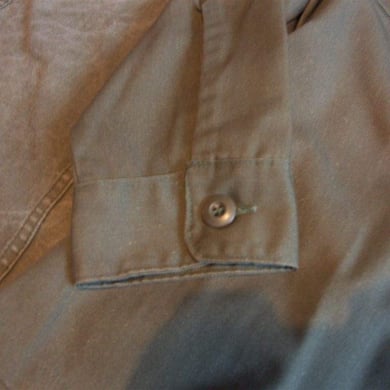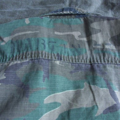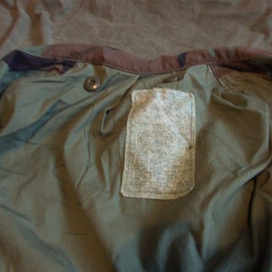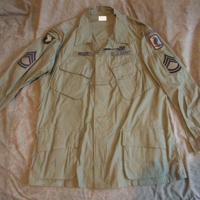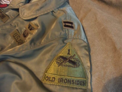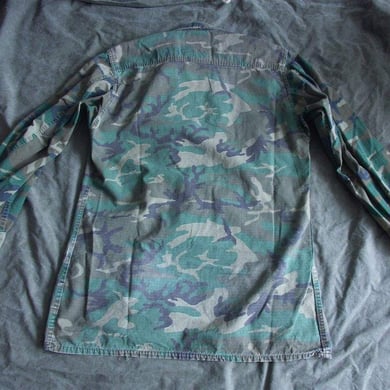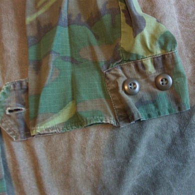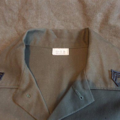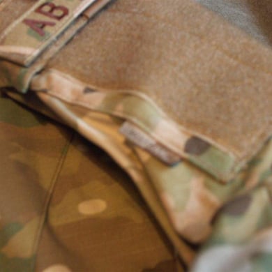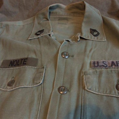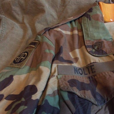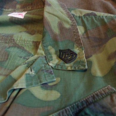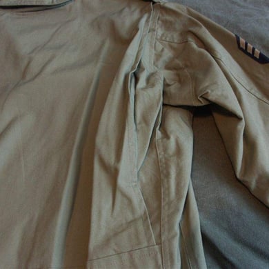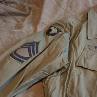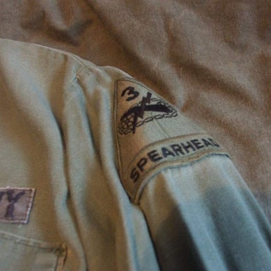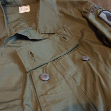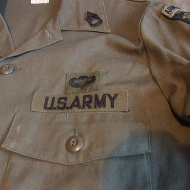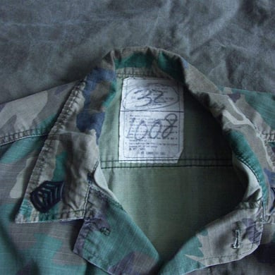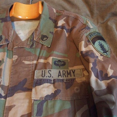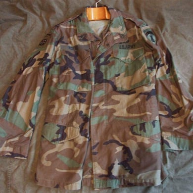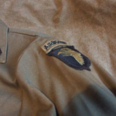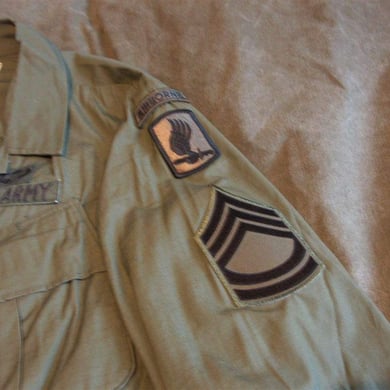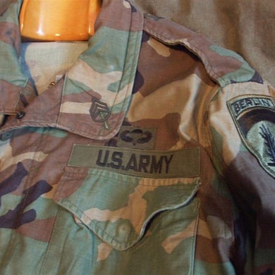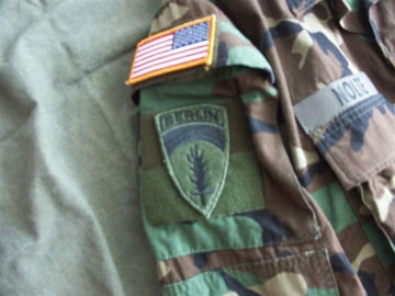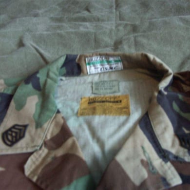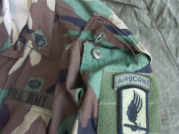 Dies ist ein BDU shirt, welches etwa zeitgleich zur Einführung der OTV bodyarmor für das Tragen dieser Weste geändert wurde. Hierbei wurden die unteren Taschen der typischen BDU auf die Oberarme genäht und gleichzeitig eine Klettfläche zum Anbringen der Einheitsabzeichen und der Flagge aufgenäht. Hier sind aus Stoff aufgenähte Rangabzeichen eines Staff Sergeant am Kragen vorhanden. Auf dem linken Oberarm befindet sich das Einheitsabzeichen der 173rd Airborne Brigade, auf dem linken Oberarm das Abzeichen der Berlin Brigade und die US Flagge farbig auf dem Taschendeckel. Namensband, US Army Schriftzug und Qualifizierungsabzeichen sind jedoch weiterhin aufgenäht.